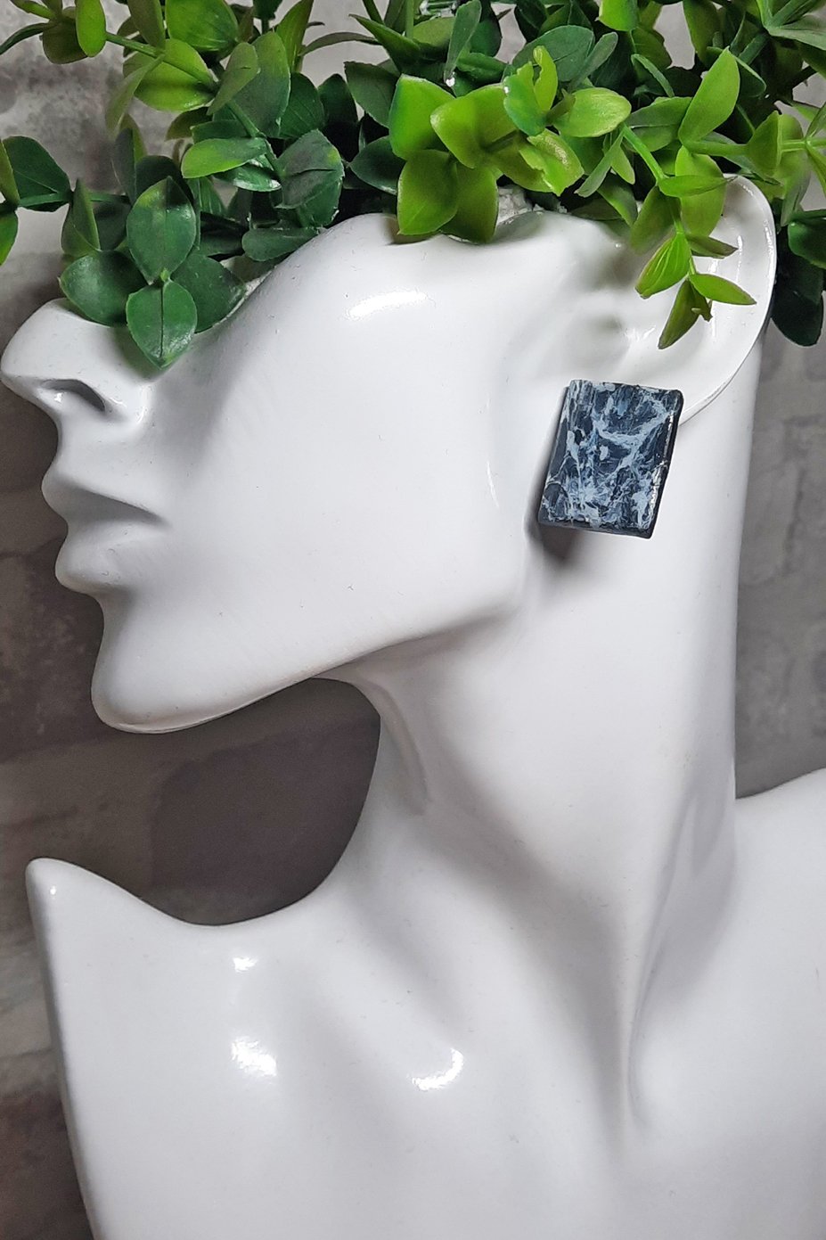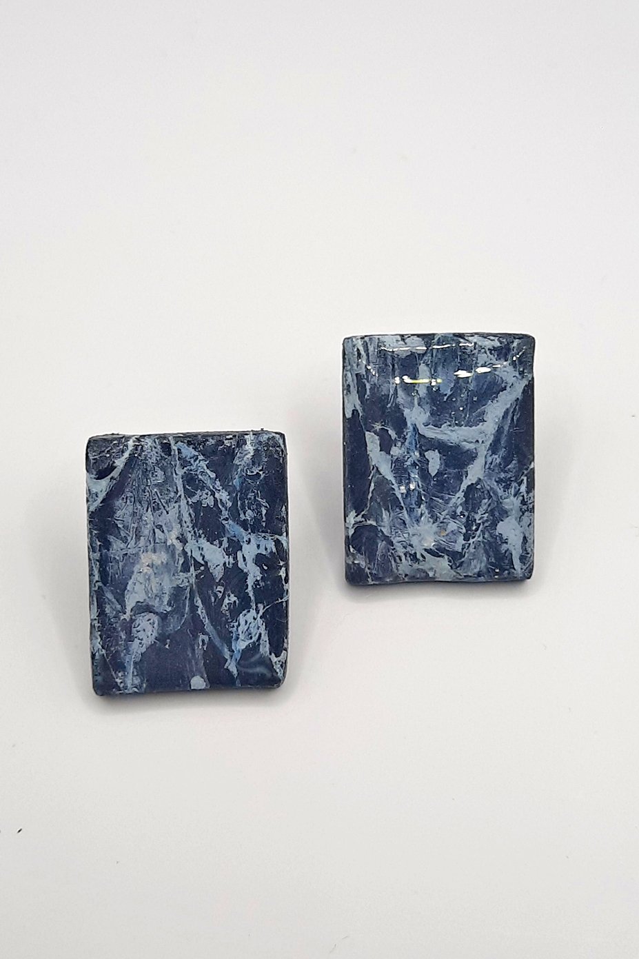 Περιγραφή: Καρφωτά σκουλαρίκια με εφέ μαρμάρου από πολυμερικό πηλό σε τετράγωνο σχήμα με σκούρα μπλε & άσπρα νερά, καλυμμένα με ιριδίζουσα σκόνη & υγρό γυαλί.