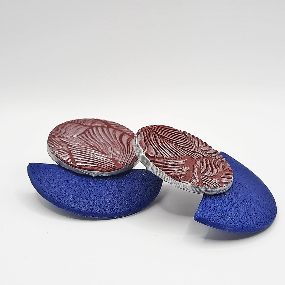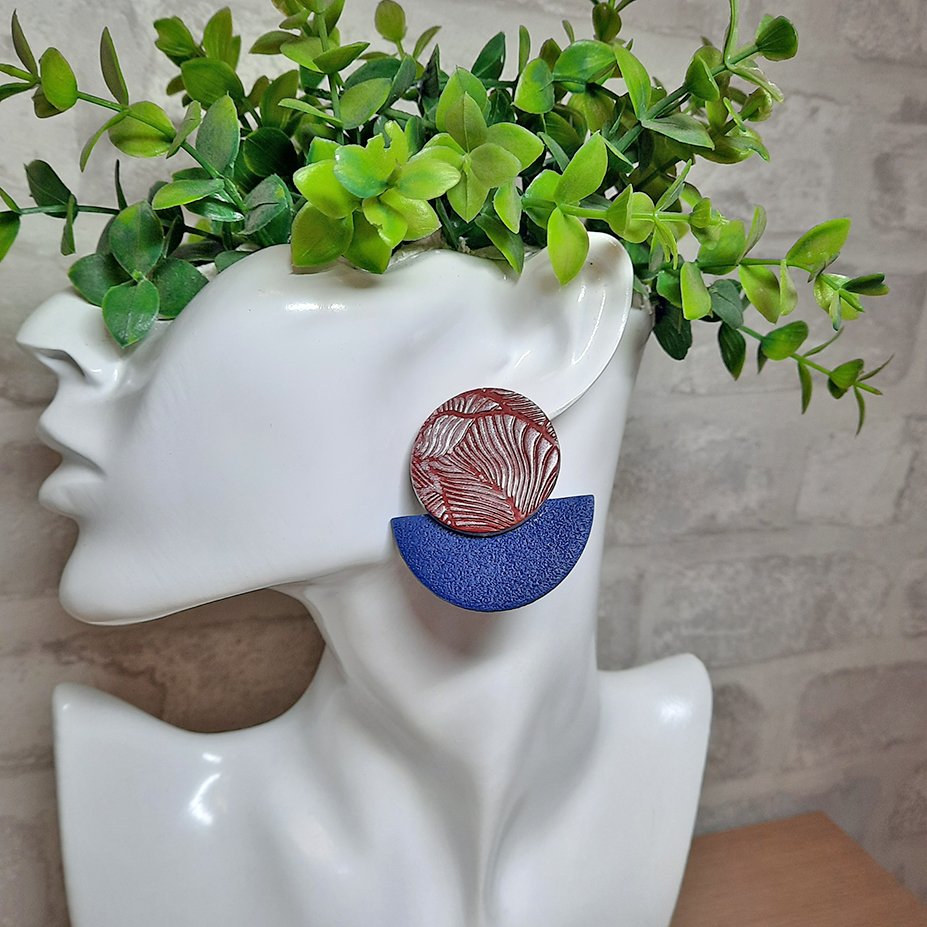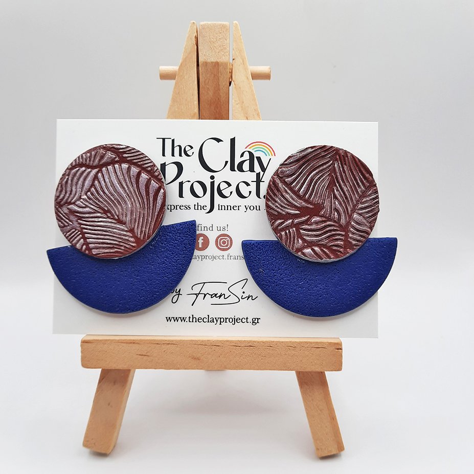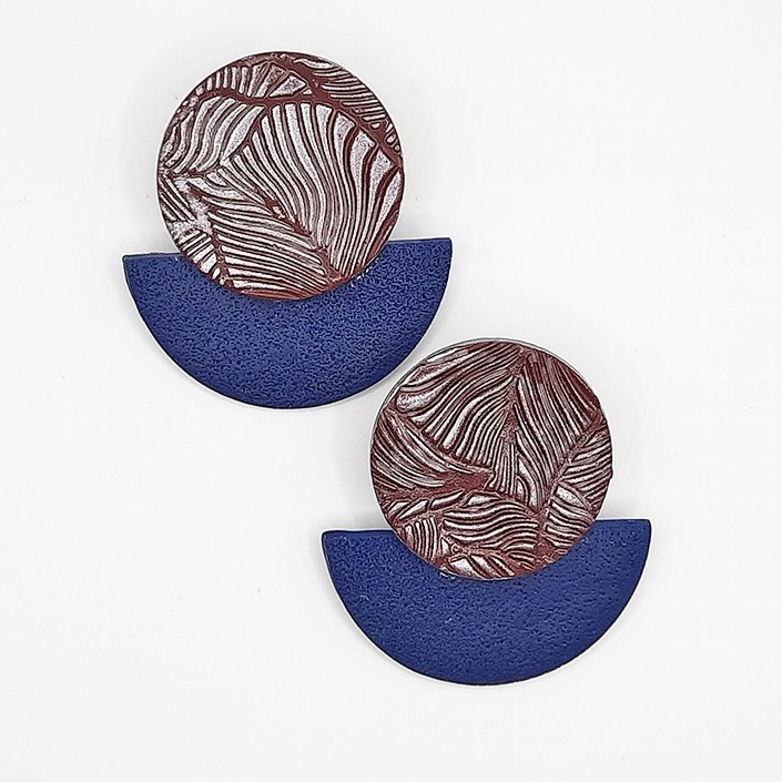Περιγραφή: Καρφωτό σκουλαρίκι σε μπορντό και μπλε χρώμα. Στρογγυλό πάνω μέρος σε μπορντό χρώμα, χαραγμένο με μοτίβο & ιριδίζουσα σκόνη. Το κάτω ημικυκλικό μέρος είναι μπλε χρώματος με σαγρέ υφή. Οι διαστάσεις του είναι 4,5 * 4,5