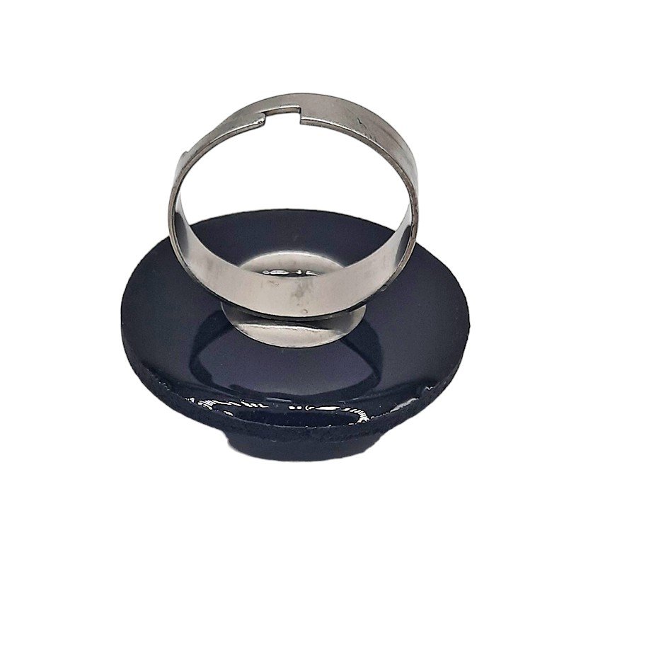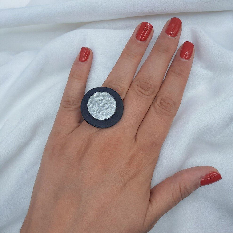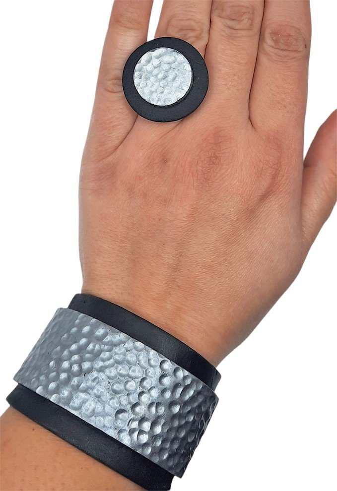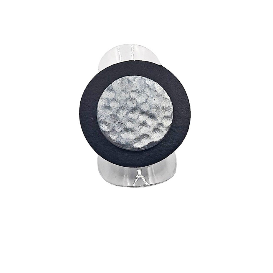 Περιγραφή: Μαύρος πηλός με όψη δέρματος και ασημί φάσα σε στυλ σφυρήλατου.