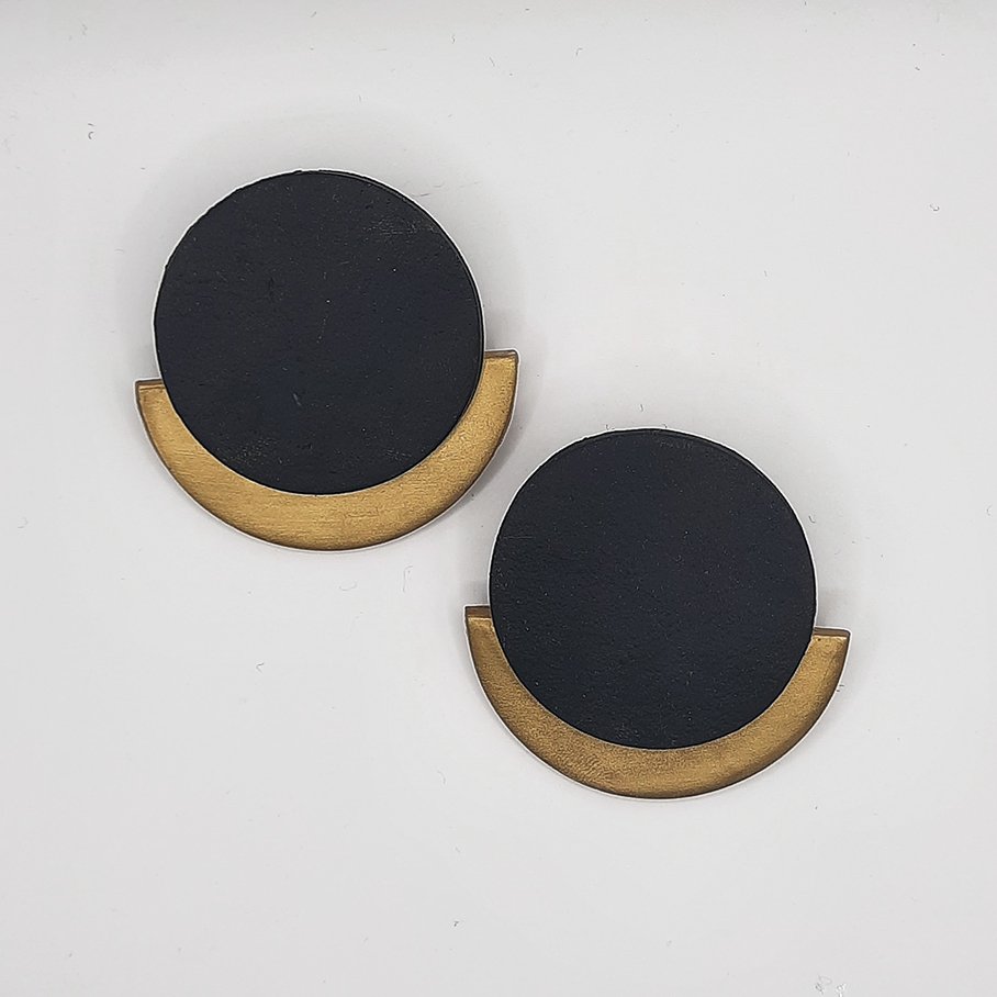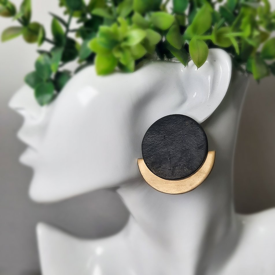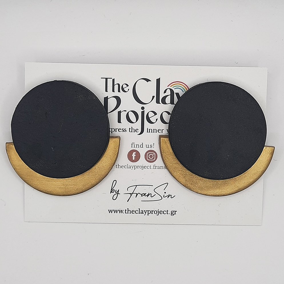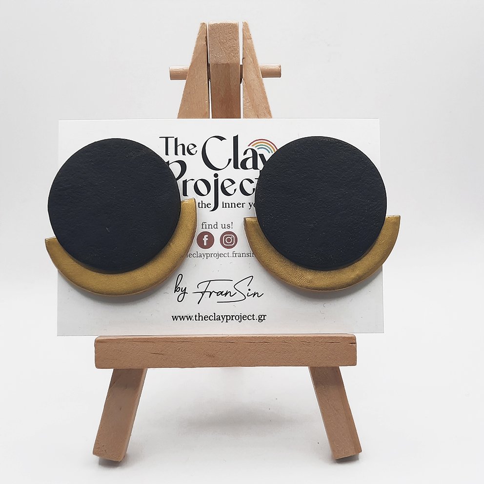 Περιγραφή: Μαύρος κύκλος από πηλό σε υφή δέρματος & χρυσό ημικύκλιο.