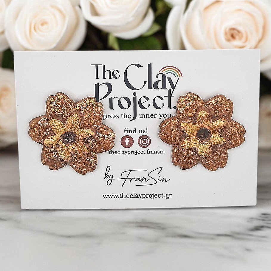 Περιγραφή: Διπλό καρφωτό λουλούδι σε χρυσή απόχρωση με κομμάτια φύλλα χρυσού. Καλυμμένο με υγρό γυαλί.
