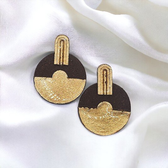 ■ Περιγραφή: Σκουλαρίκια σύνθετα σε καφέ χρώμα με φύλλα χρυσού και υγρό γυαλί.